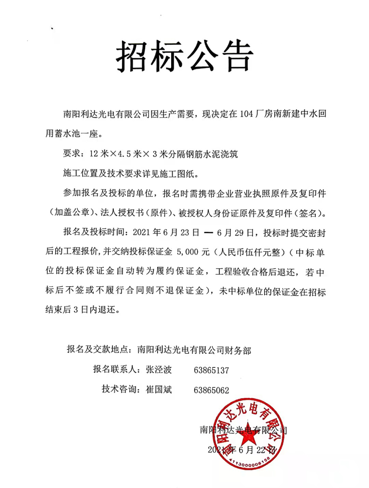 104廠(chǎng)房南新建中水回用蓄水池一座招標公告