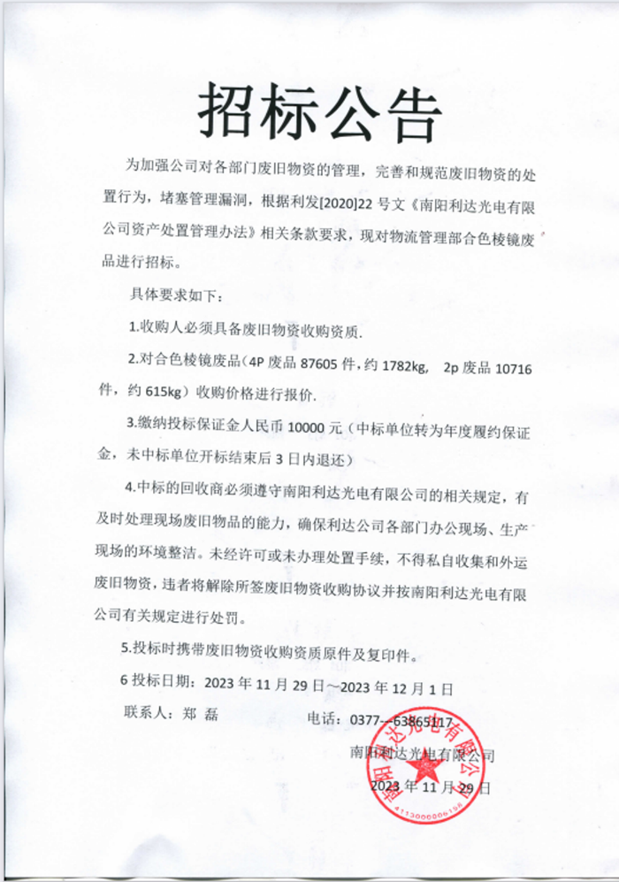 - (2023-11-29)招標公告(合色棱鏡)廢品招標